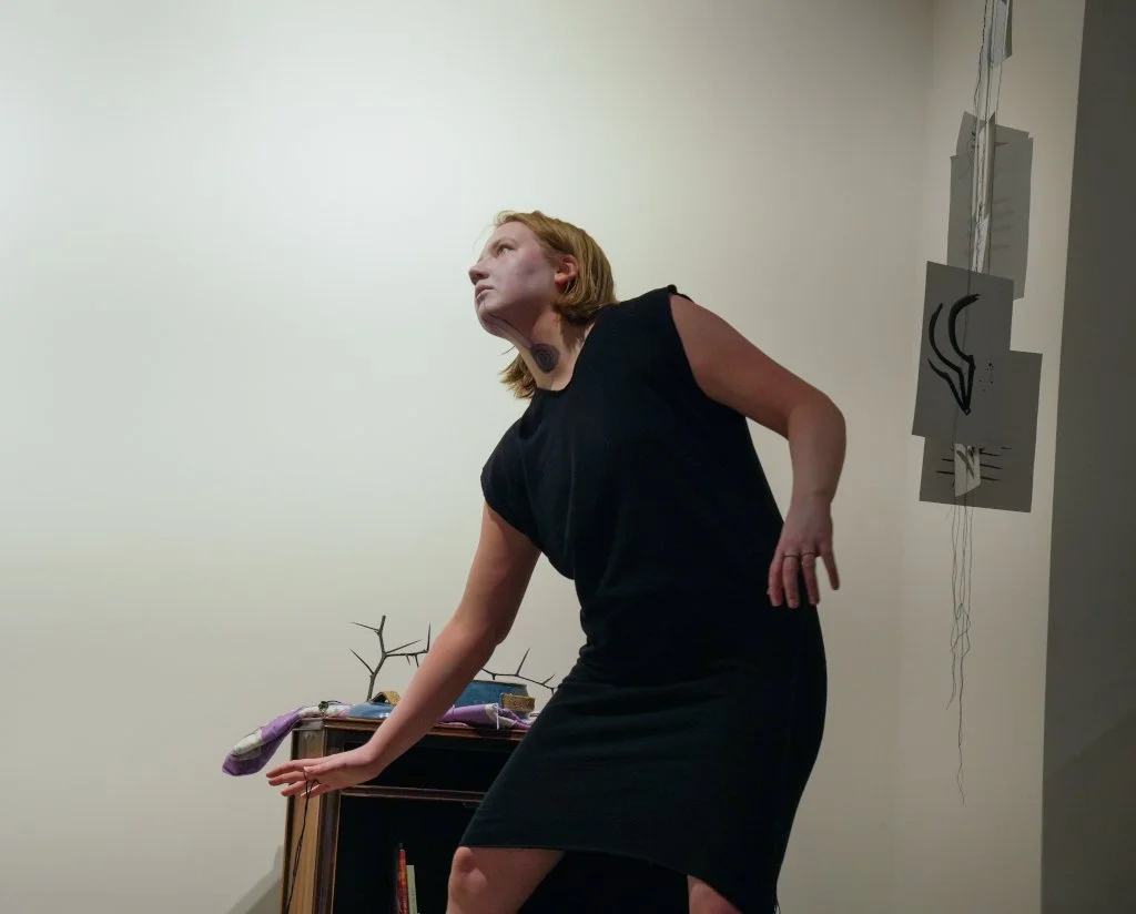 • I move my body in primal shapes and make sounds as a vehicle for trance in parallel spaces until I am in an ecstatic grief state, and it feels as if things that are not of me are coming through. I move my body until the work feels complete or until signals from my physical vessel pull me back to self-tend.