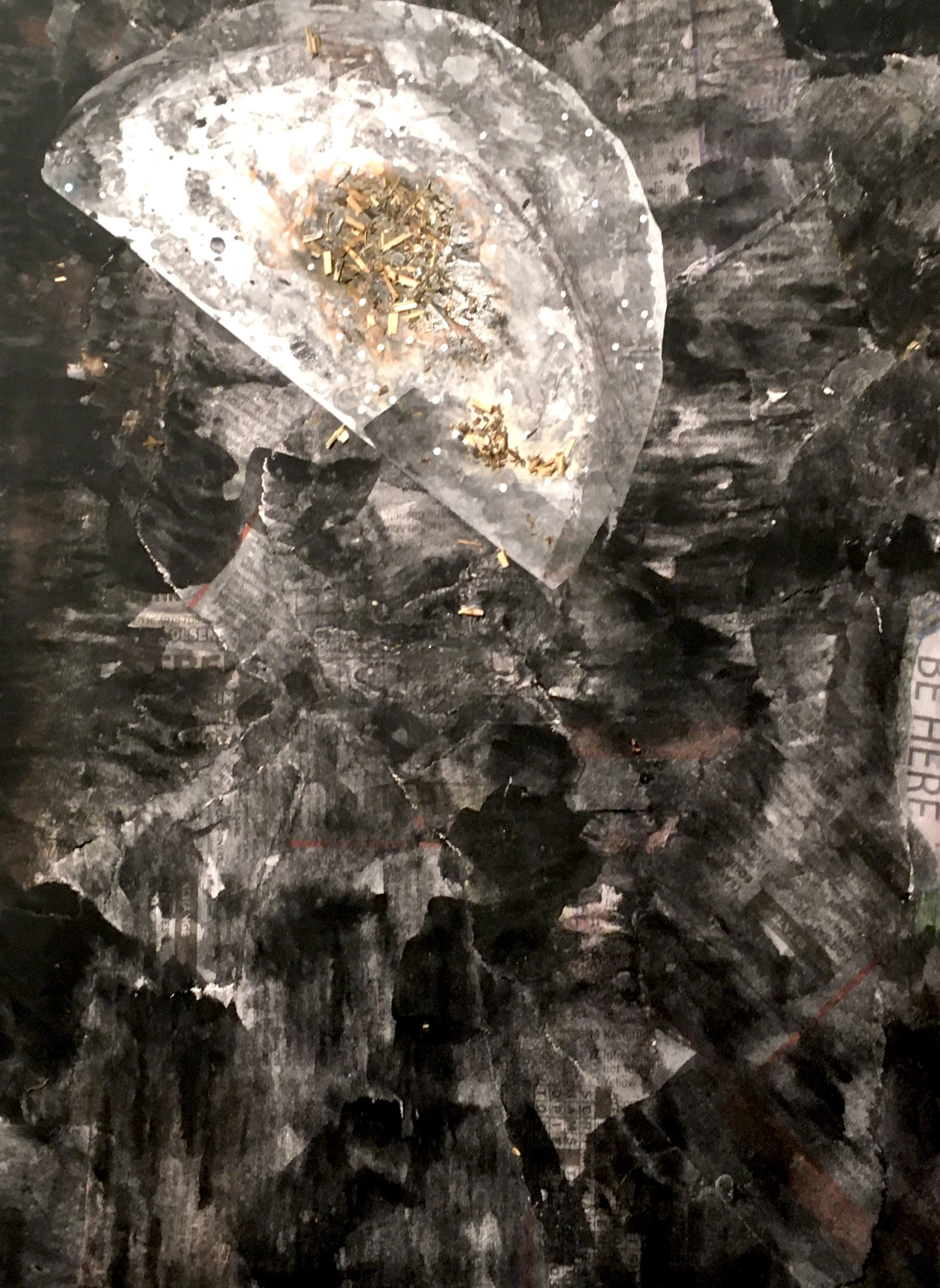 From an Art Ritual I facilitated for myself. When I had to paint my anger and my fear after escaping an abusive situation. Newspaper, black watercolor, my saliva, mugwort and motherwort (for protection, guidance, and hexing patriarchal abuse.)